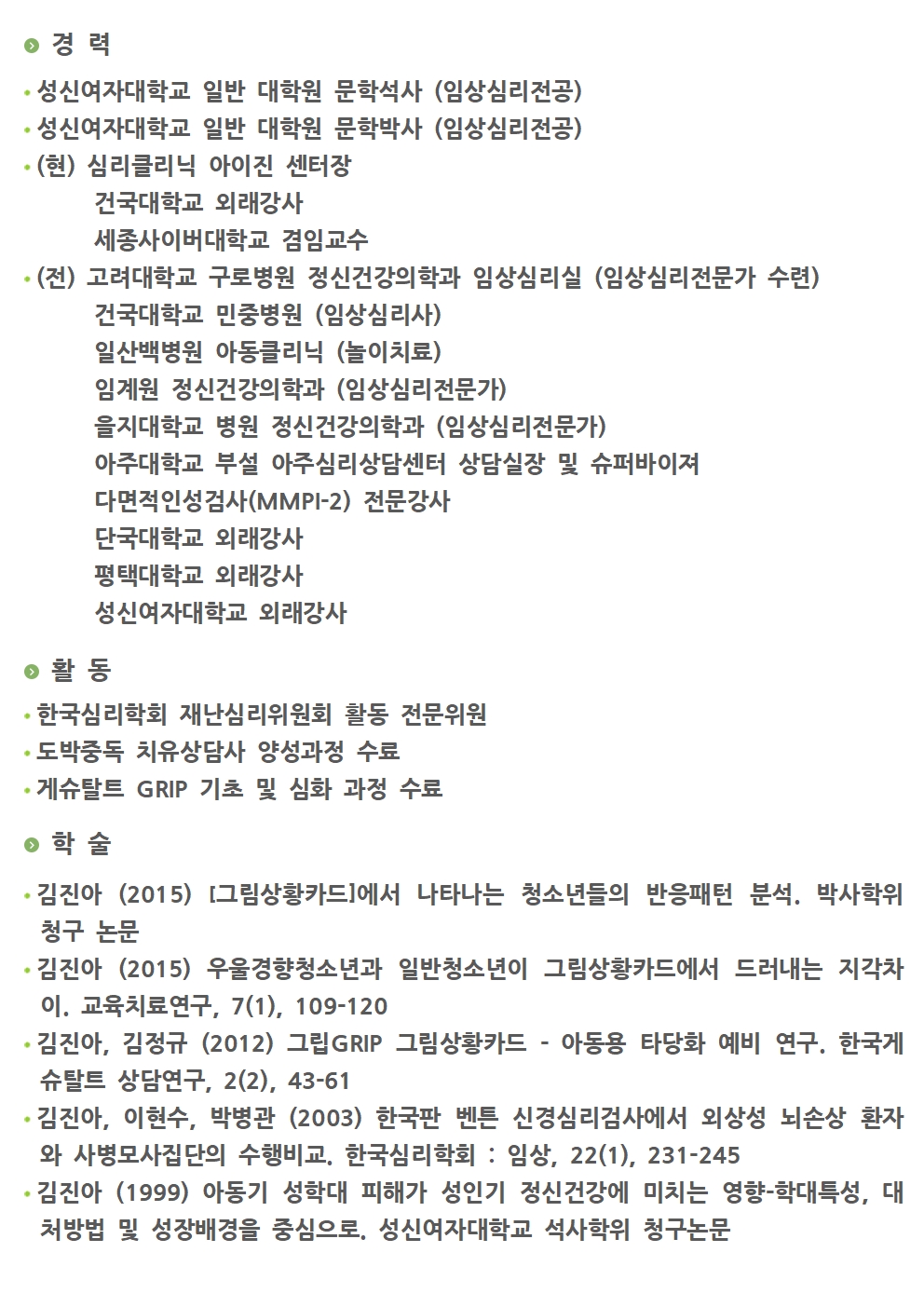 심리클리닉 아이진 상담 선생님을 소개합니다. 센터장 김진아 임상심리 박사 임상심리전문가 정신건강임상...
